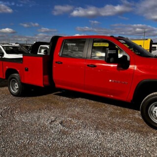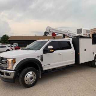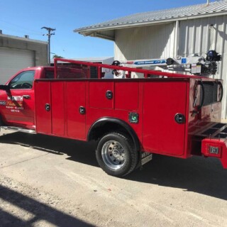Dual rear wheel Knapheide service body, custom paint job, Tommygate liftgate with aluminum platform, custom build material rack and spray in bed liner.