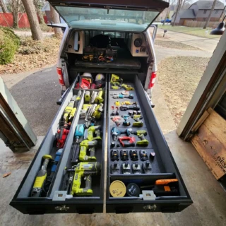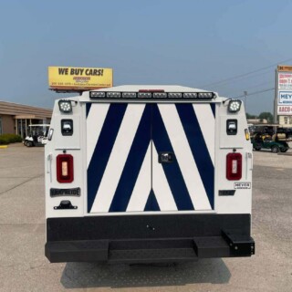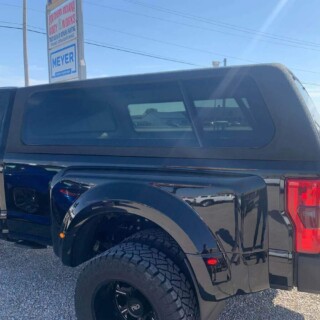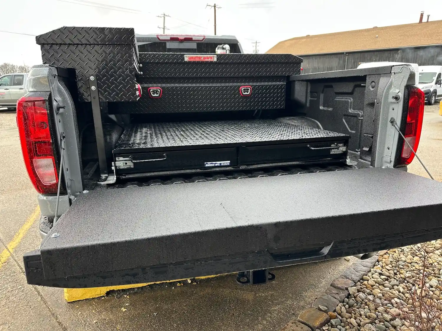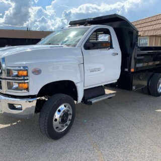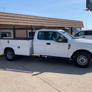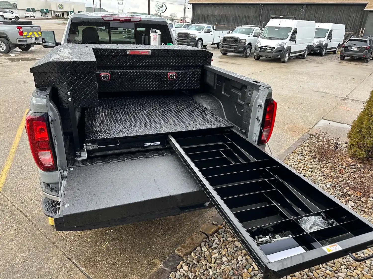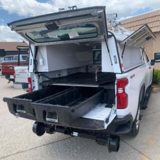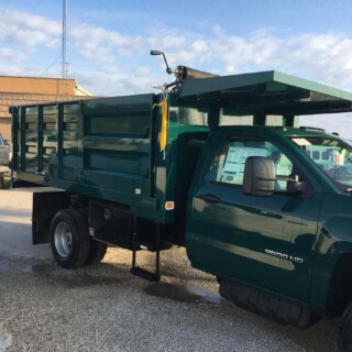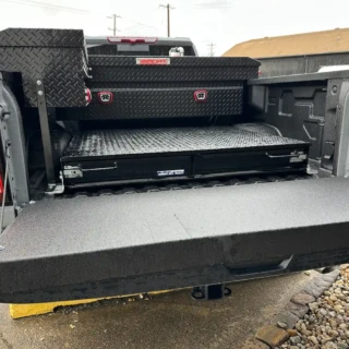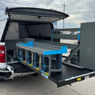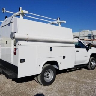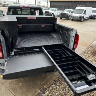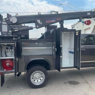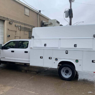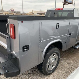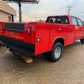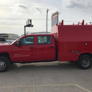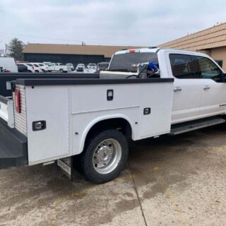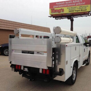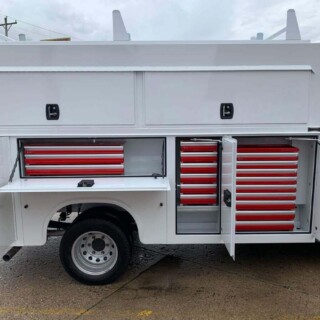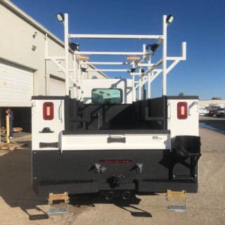 Dual rear wheel Knapheide service body, custom paint job, Tommygate liftgate with aluminum platform, custom build material rack and spray in bed liner.