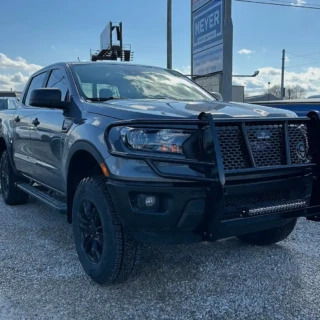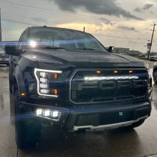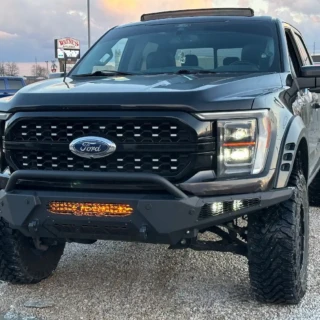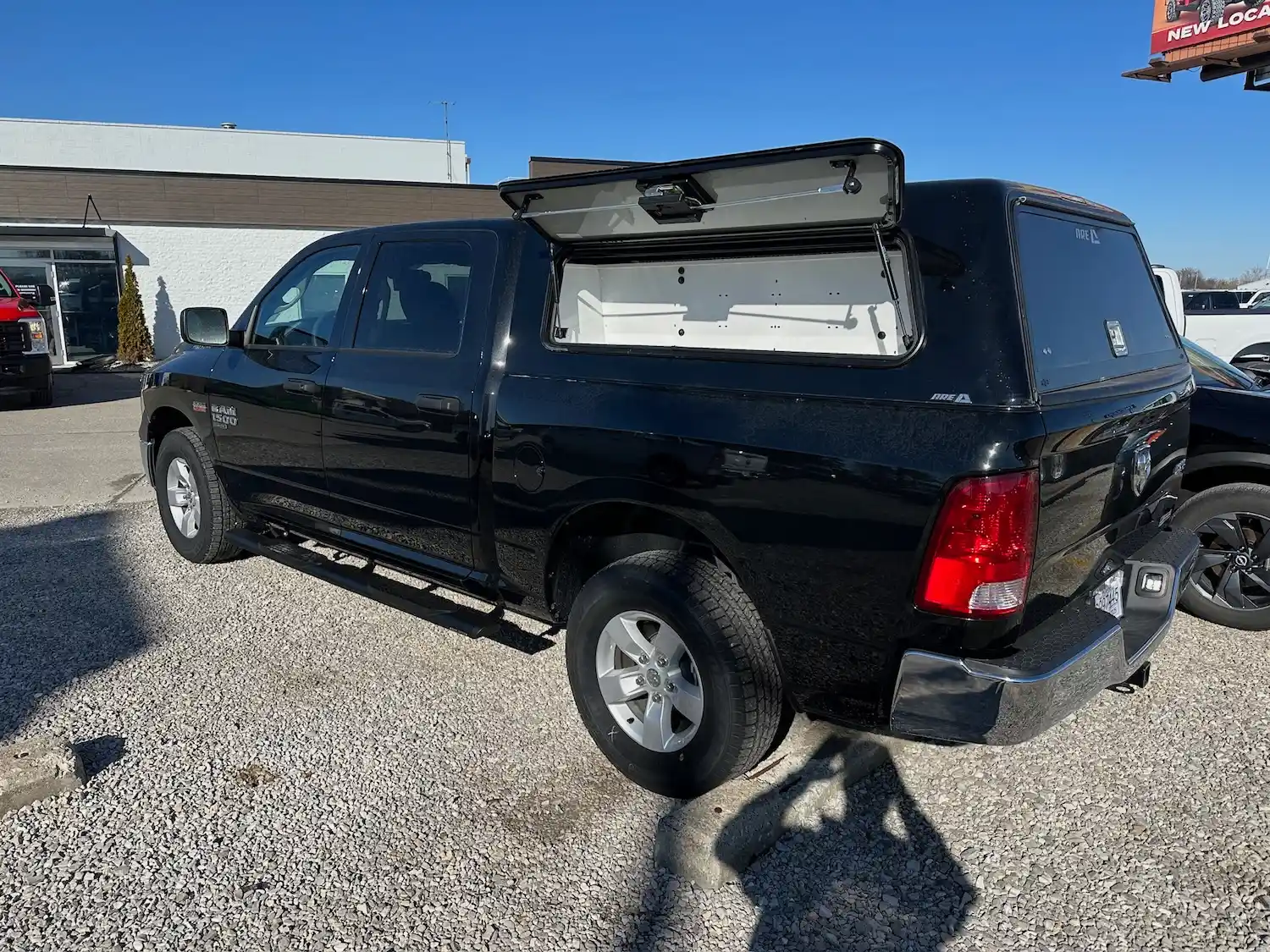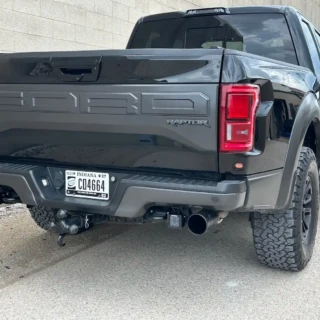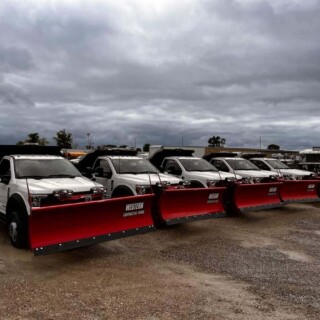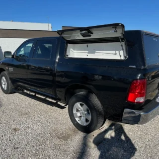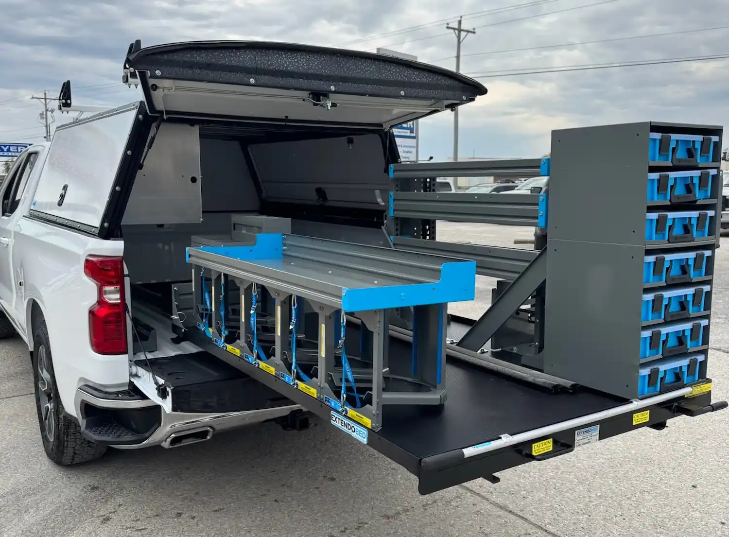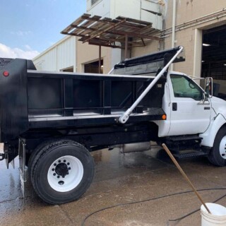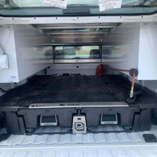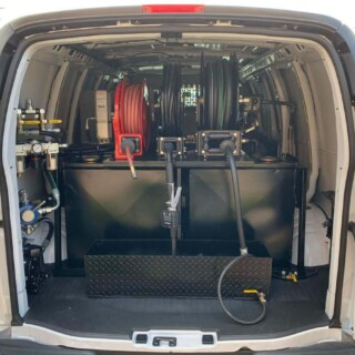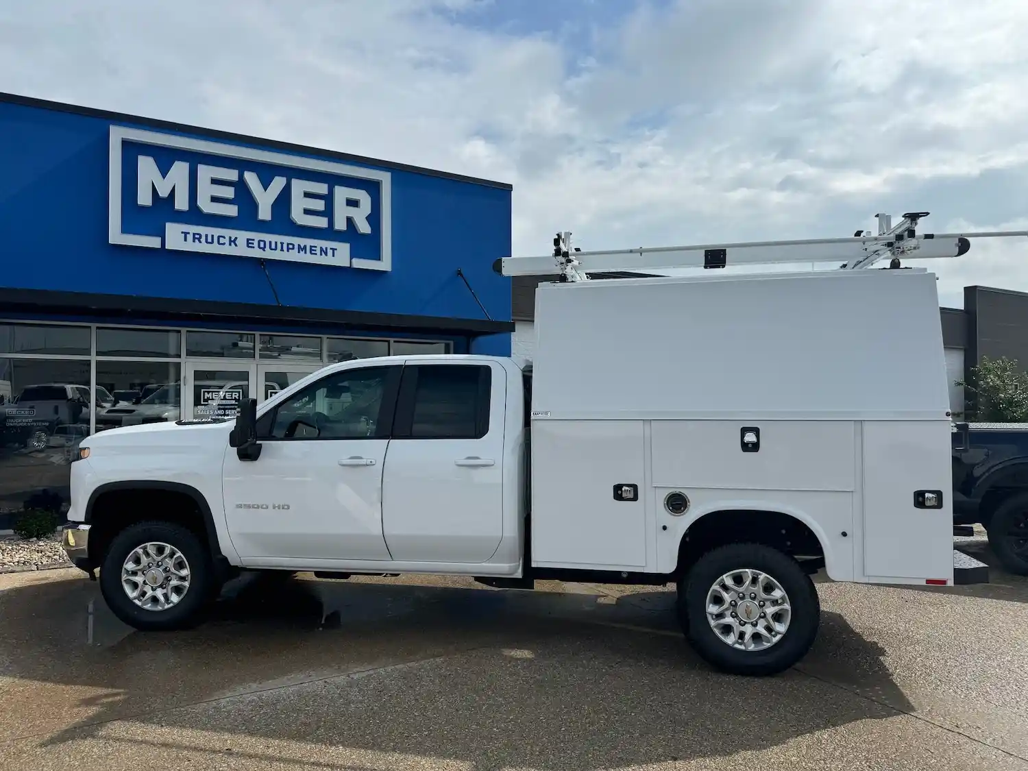 Dual rear wheel Knapheide service body, custom paint job, Tommygate liftgate with aluminum platform, custom build material rack and spray in bed liner.